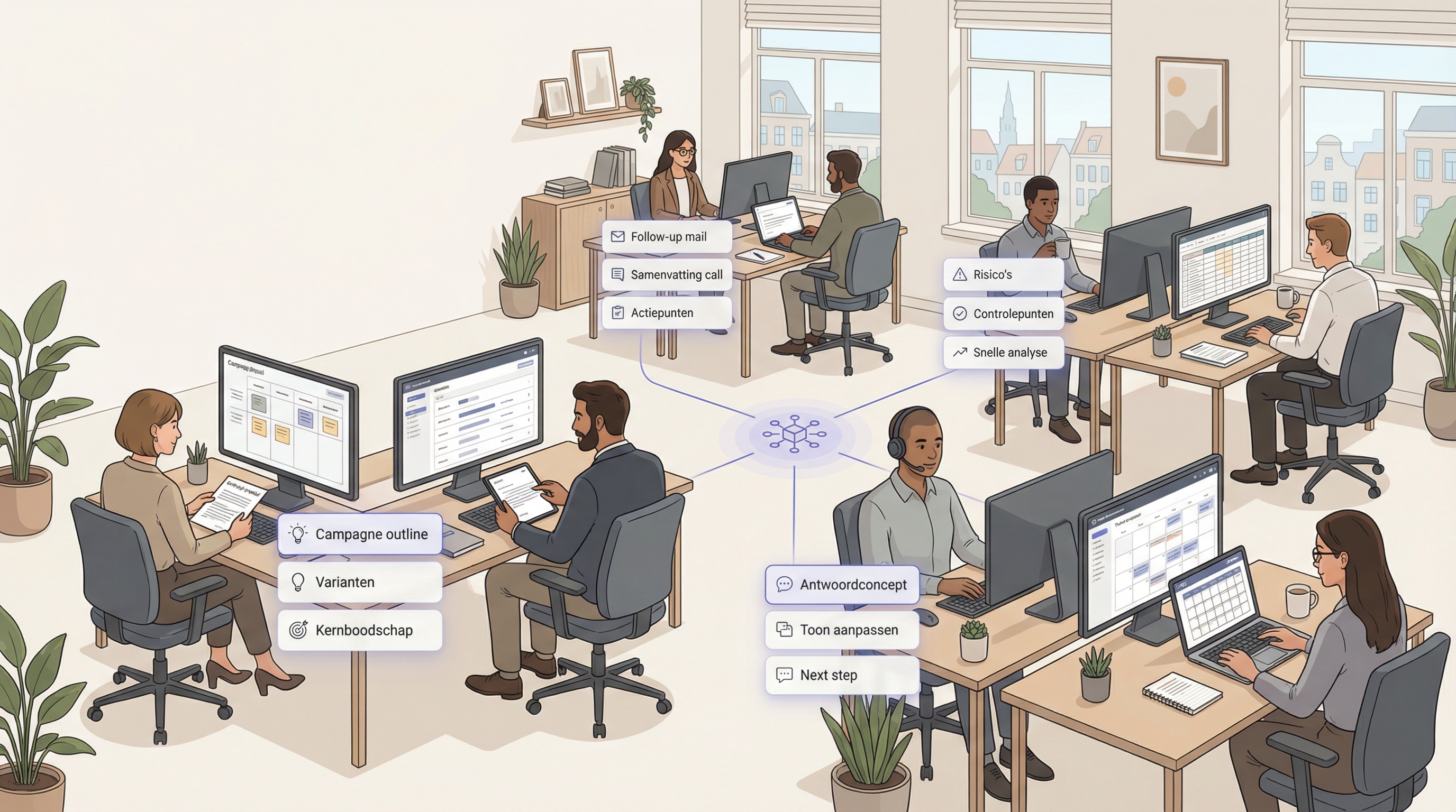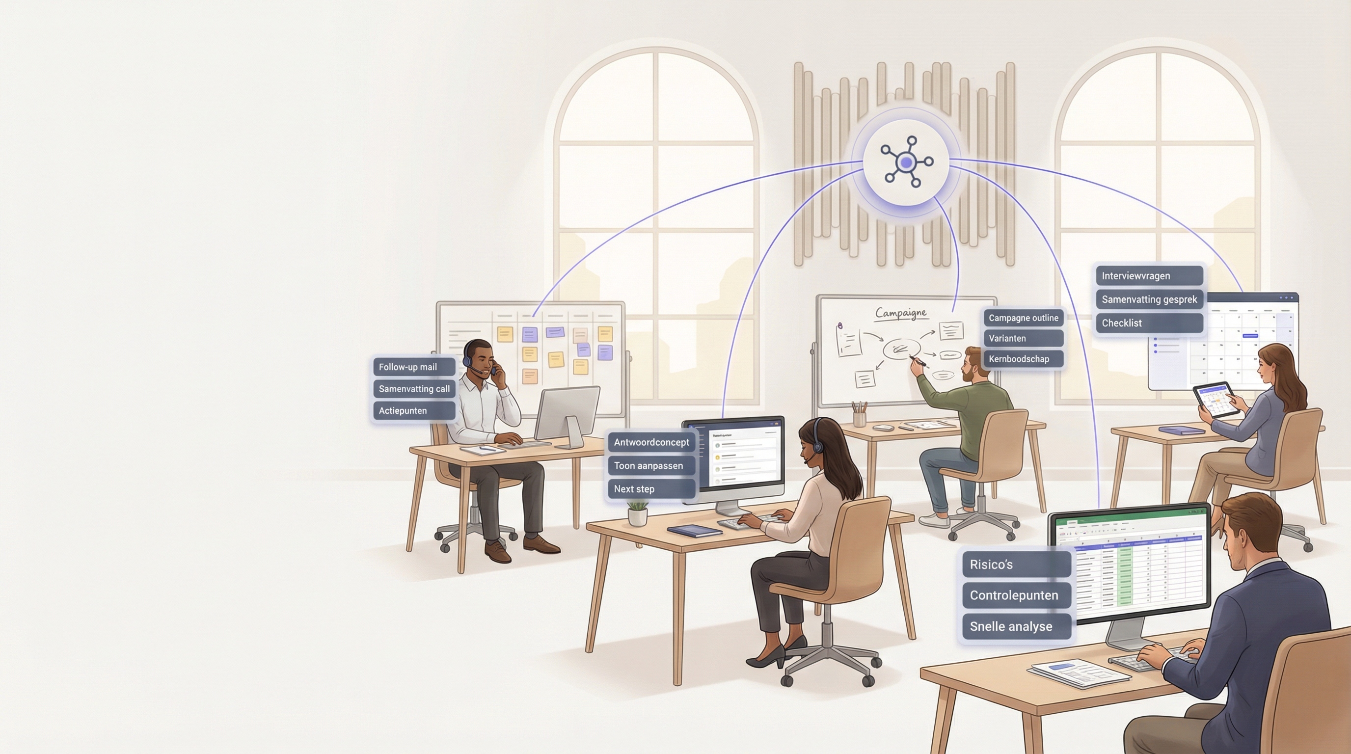 Organisaties (20–250 medewerkers) waar A.I op de radar staat, maar nog niet structureel landt in terugkerend werk. Denk aan: adviesbureaus, accountancy, marketing, IT-dienstverlening, juridisch, HR, engineering — organisaties waar mensen denkwerk doen.
